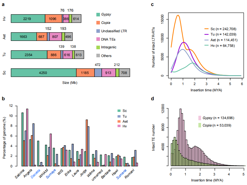 與烏拉爾圖小麥、節(jié)節(jié)麥及大麥的LTR-RTs進(jìn)行比較發(fā)現(xiàn):(1)Gypsy是威寧黑麥基因組擴(kuò)張的主要原因之一(Fig. 2a),并且有3個(gè)LTR-RT家族(Daniela, Sumaya, Sumana)在威寧黑麥中特異擴(kuò)張,其中Daniela的占比最高 (Fig. 2b)。(2)威寧黑麥中完整的LTR-RTs插入時(shí)間存在獨(dú)特的雙峰分布(Fig. 2c),最近一個(gè)擴(kuò)增峰出現(xiàn)在50萬(wàn)年前,另出現(xiàn)在1.7 百萬(wàn)年(MYA)左右(與大麥相同) (Fig. 2c)。(3)這種雙峰分布模式由Gypsy?RTs的擴(kuò)增主導(dǎo)(Fig. 2d)。