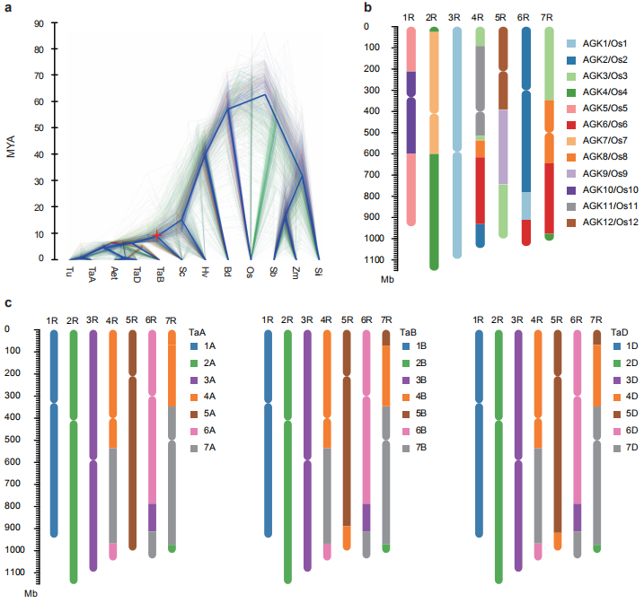 通過比較威寧黑麥、烏拉爾圖小麥、節(jié)節(jié)麥、普通小麥(亞基因組TaA、TaB和TaD)、大麥、水稻Os(Oryza sativa ssp.?japonica)、二穗短柄草Bd(Brachypodium distachyon)、玉米Zm(Zea mays)、高粱Sb(Sorghum bicolor)、谷子Si(Setaria italica)基因組,共找到2517個(gè)單拷貝同源基因。通過對(duì)單拷貝基因組構(gòu)建進(jìn)化樹和計(jì)算分化時(shí)間發(fā)現(xiàn),在大麥和小麥分化后(15MYA)黑麥和二倍體小麥發(fā)生了分化(9.6 MYA) (Fig. 3a)。