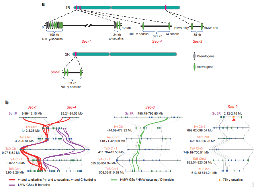 在威寧黑麥中未發(fā)現(xiàn)小麥低分子量麥谷蛋白亞基(LMW-GSs)或大麥B-hordein的同源序列(圖5b),表明在黑麥進(jìn)化過程中攜帶這些基因的染色體片段缺失,這可能是1BL1RS易位系小麥品種中,品質(zhì)受影響的主要原因。并且在威寧黑麥基因組中未發(fā)現(xiàn)α-醇溶蛋白基因,這說明小麥及其近緣種的α-醇溶蛋白(α-gliadin)基因可能在小麥和黑麥分化之后進(jìn)化產(chǎn)生的。這些SSP分析結(jié)果闡明了黑麥堿基因座的結(jié)構(gòu)和組成,這將有助于進(jìn)一步研究黑麥、小黑麥和小麥的加工和營(yíng)養(yǎng)品質(zhì)。
