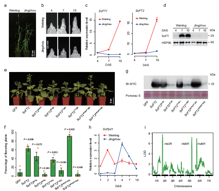 在長(zhǎng)日照條件下,威寧黑麥比荊州黑麥提前抽穗10-12天(圖6a),這與威寧黑麥莖尖分生組織發(fā)育更快有關(guān)(圖6b)。在威寧黑麥基因組中,注釋到在長(zhǎng)日照條件下高表達(dá)的兩個(gè)開花位點(diǎn)(FT)基因ScFT1(ScWN4R01G446100)和ScFT2(ScWN3R01G192500)。播種后7天和10天,ScFT1ScFT2在威寧黑麥中的表達(dá)水平顯著高于荊州黑麥(圖6c),且ScFT蛋白在黑麥中積累到相對(duì)較高水平,而荊州黑麥中幾乎沒有(圖6d)。檢測(cè)到的ScFT蛋白的大?。▇29 kDa)比預(yù)測(cè)出的ScFT1和ScFT2的分子量大(~19 kDa)(圖6d),表明ScFT蛋白具有潛在的翻譯后修飾。用高效檢測(cè)磷蛋白的磷酸標(biāo)記SDS-PAGE分析表明,威寧黑麥中ScFT確實(shí)發(fā)生了翻譯后磷酸化修飾。