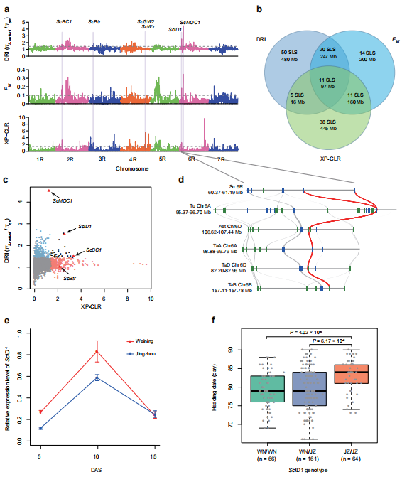 對(duì)馴化基因的分析可以促進(jìn)對(duì)作物性狀的理解和改良,但在黑麥中這類基因的分子分析方面進(jìn)展甚微。作者通過全基因組選擇清除分析,利用在栽培黑麥和瓦維洛夫黑麥(S. vavilovii)之間鑒定的123647個(gè)SNPs,挖掘黑麥馴化相關(guān)染色體區(qū)域和基因座。DRI、FST、XP-CLR分析中,共同識(shí)別到11個(gè)選擇信號(hào)(圖7a-c)。通過與水稻和大麥的共線性比較,發(fā)現(xiàn)了一些可能的選擇清除位點(diǎn),包括已在水稻或大麥中已被功能分析的ScBC1、ScBtrScGW2、ScMOC1、ScID1ScWx的同源基因(圖7a-c)。