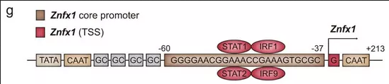 為了確定哪些核苷酸和區(qū)域Znfx1轉(zhuǎn)錄中很重要,使用promoter 2.0( http://www.cbs.dtu.dk/services/promoter/)、JASPAR(http://jaspar.genereg.net/)和CpGplot(http://www.ebi.ac.uk/Tools/seqstats/emboss_cpgplot/)進(jìn)行識(shí)別,其中包含TATA框、GC框和CAAT框的Znfx1的-1,064~+63之間的區(qū)域,是啟動(dòng)子。對(duì)轉(zhuǎn)錄因子結(jié)合位點(diǎn)的進(jìn)一步分析表明,Znfx1的啟動(dòng)子在相對(duì)集中和重疊的區(qū)域中包含STAT1、STAT2、IRF1和IRF9結(jié)合基序?;谶@些分析,構(gòu)建了一個(gè)Znfx1啟動(dòng)子報(bào)告基因載體,包含?1,064~+63之間的區(qū)域,以及一個(gè)突變的報(bào)告基因構(gòu)建體,其中缺失了STAT1、STAT2、IRF1和IRF9結(jié)合motif。接下來(lái),STAT1,STAT2,IRF1或IRF9過(guò)表達(dá)質(zhì)粒和2個(gè)報(bào)告基因載體轉(zhuǎn)染293T細(xì)胞,報(bào)告基因分析表明,在STAT1、STAT2、IRF1或IRF9存在的情況下,報(bào)告基因的表達(dá)可以由Znfx1啟動(dòng)子誘導(dǎo),而不能由缺少轉(zhuǎn)錄因子結(jié)合位點(diǎn)的啟動(dòng)子載體誘導(dǎo)(圖1l)??偠灾?,ZNFX1是一個(gè)ISG,其病毒感染后的上調(diào)取決于JAK1-STAT1級(jí)聯(lián)反應(yīng)。