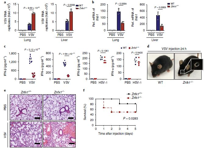 ZNFX1在宿主體內(nèi)對(duì)抗病毒感染的防御中的重要性:通過(guò)尾靜脈向野生型和Znfx1-/-小鼠注射了VSV。與野生型小鼠相比,Znfx1-/-小鼠的肺和肝中的VSV復(fù)制增強(qiáng)了(圖3a),隨著肺和肝中Ifnb1表達(dá)的減少,在Znfx1-/-小鼠中血清中IFN-α和IFN-β的分泌降低(圖3b,c)。而HSV-1感染后,Znfx1-/-和野生型小鼠之間血清中的IFN-α和IFN-β沒(méi)有差異(圖3c)。有趣的是,VSV感染一天后,Znfx1-/-小鼠中有80%患有結(jié)膜炎,這是VSV感染的早期癥狀(圖3d)。另外,觀察到VSV感染后炎性細(xì)胞更多地滲透到Znfx1-/-小鼠的肺中(圖3e),并且Znfx1-/-小鼠在存活試驗(yàn)中對(duì)VSV感染的抵抗力較弱(圖3f)。這些數(shù)據(jù)表明,Znfx1缺乏后體內(nèi)產(chǎn)生較少的I型IFN,削弱了針對(duì)RNA病毒感染的先天免疫反應(yīng)??傊?,ZNFX1專門針對(duì)RNA病毒發(fā)揮其抗病毒特性。