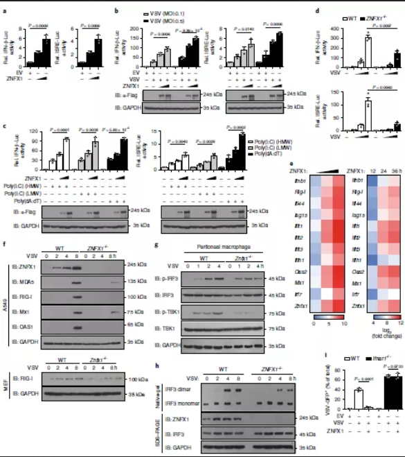 為了研究ZNFX1在IFN信號(hào)傳導(dǎo)中的作用,通過(guò)ZNFX1過(guò)表達(dá)質(zhì)粒和Ifnb1-reporter或IFN刺激的應(yīng)答元件(ISRE)報(bào)告質(zhì)粒瞬時(shí)轉(zhuǎn)染A549細(xì)胞進(jìn)行螢光素酶報(bào)告基因分析,然后進(jìn)行或不進(jìn)行VSV感染。結(jié)果表明,ZNFX1的過(guò)表達(dá)輕微激活了Ifnb1啟動(dòng)子和ISRE報(bào)告基因(圖4a)。此外,ZNFX1以劑量依賴的方式顯著增強(qiáng)了由VSV、2種類型的poly(I:C)或poly(dA:dT)觸發(fā)的Ifnb1啟動(dòng)子激活(圖4b,c)。相反,敲除Znfx1可降低VSV誘導(dǎo)的293T細(xì)胞中Ifnb1報(bào)告基因和ISRE報(bào)告基因的激活(圖4d)。Ifnb1和ISGs的轉(zhuǎn)錄以劑量和時(shí)間依賴性的方式誘導(dǎo)(圖4e),當(dāng)ZNFX1在A549細(xì)胞中過(guò)表達(dá)時(shí)隨著劑量和時(shí)間增強(qiáng)反之敲除ZNFX1則降低。而與野生型細(xì)胞相比,Znfx1-/-A549和MEF細(xì)胞中ISG蛋白表達(dá)量分別減少(圖4f)。VSV感染后Znfx1-/-巨噬細(xì)胞中TBK1和IRF3的磷酸化低于野生型巨噬細(xì)胞(圖4g)。在VSV感染的Znfx1-/-293T細(xì)胞中,IRF3的二聚化也低于野生型細(xì)胞(圖4h)。野生型A549細(xì)胞中觀察到了VSV的限制性復(fù)制,但在Ifnar1-/-A549細(xì)胞中未觀察到(圖4i)。所有這些數(shù)據(jù)表明,ZNFX1通過(guò)誘導(dǎo)I型IFN的產(chǎn)生而參與抗病毒免疫反應(yīng),其抗病毒特性也取決于IFN信號(hào)傳導(dǎo)。