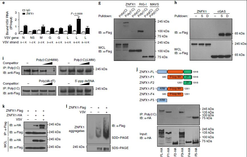 為了進(jìn)一步評(píng)估與ZNFX1結(jié)合的病毒RNA的性質(zhì),首先將核酸類似物連接的磁珠與經(jīng)Flag標(biāo)記的ZNFX1、RIG-I或MAVS過(guò)表達(dá)的293T細(xì)胞裂解液一起孵育,并進(jìn)行了pulldown試驗(yàn)以顯示ZNFX1和RIG-I蛋白與poly(I:C)結(jié)合,但不與poly(C)結(jié)合(圖5g)。cGAS而非ZNFX1結(jié)合單鏈和雙鏈DNA(ISD,一個(gè)45 bp的雙鏈DNA;圖5h)。競(jìng)爭(zhēng)實(shí)驗(yàn)顯示ZNFX1蛋白與HMW poly(I:C)優(yōu)先結(jié)合,而不是與LMW poly(I:C)、poly(dA:dT)或5’pppdsRNA優(yōu)先結(jié)合(圖5i)。為了找到ZNFX1的poly(I:C)結(jié)合位點(diǎn),準(zhǔn)備了ZNFX1的截短版本并進(jìn)行了poly(I:C) pulldown實(shí)驗(yàn)。結(jié)果表明,ZNFX1與poly(I:C)的結(jié)合需要ARM域和P環(huán)結(jié)構(gòu)域,而不是ZF鋅指域(圖5j)。病毒感染后ZNFX1的寡聚化增強(qiáng)(圖5k,1)。因此,ZNFX1充當(dāng)RNA病毒傳感器,它傾向于結(jié)合長(zhǎng)RNA分子。
