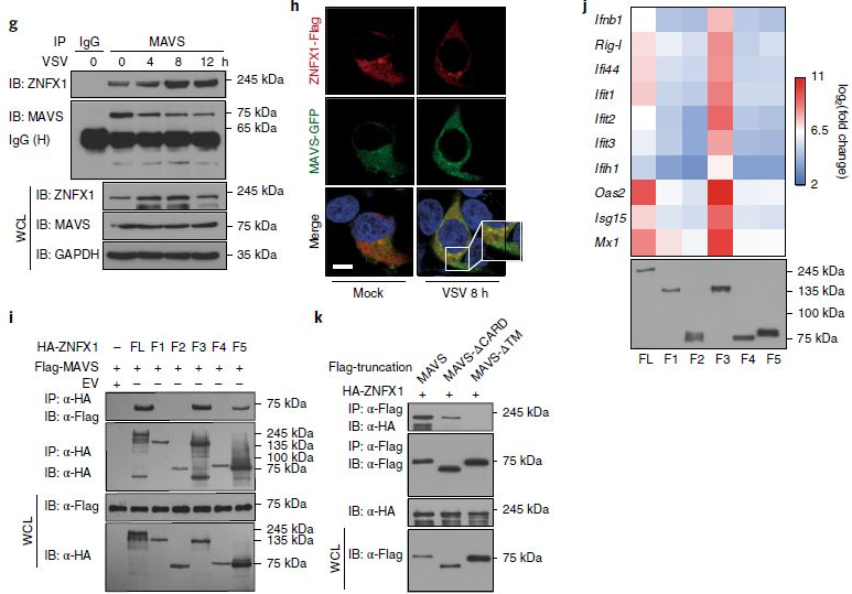 由于病毒感染導(dǎo)致ZNFX1的mRNA和蛋白質(zhì)水平表達(dá)均增強(qiáng),接下來(lái)通過(guò)將A549細(xì)胞與人重組IFN-α和IFN-β一起孵育來(lái)檢測(cè)ZNFX1是否為ISG。qRT-PCR和免疫印跡分析的結(jié)果表明ZNFX1的表達(dá)可以被IFN-α和IFN-β誘導(dǎo)(圖1h,i)。相比之下,JAK1抑制劑魯索替尼(ruxolitinib)可以抑制VSV對(duì)Znfx1 mRNA的誘導(dǎo),并且在Ifnar1-/-A549細(xì)胞中幾乎消失(圖1j,k)。