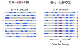 自然選擇促使有利突變在群體中保留下來,與之連鎖的中性位點(diǎn)突變頻率提升,非連鎖的中性位點(diǎn)突變頻率下降;簡單的說就是基因組某區(qū)域由于受到了選擇而消除多態(tài)性,即遺傳多樣性降低,在群體中出現(xiàn)高頻的等位基因和低頻的等位基因。