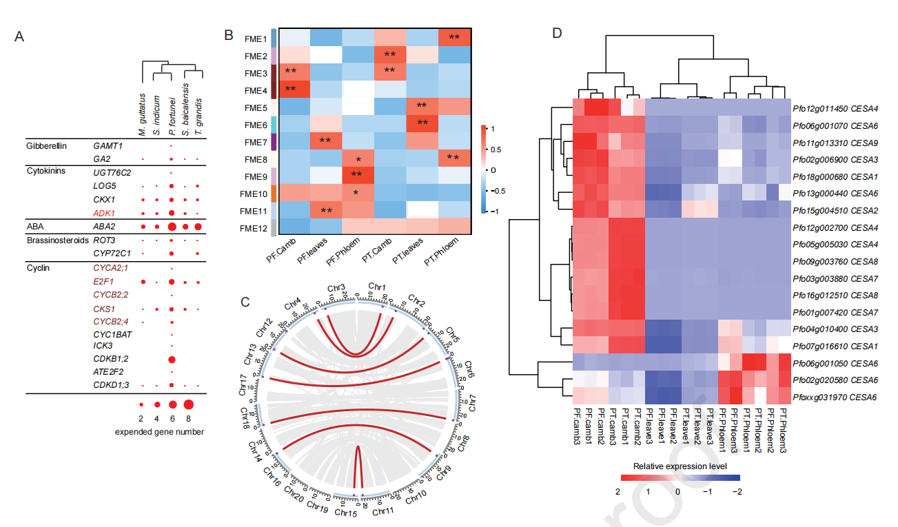 植物的形態(tài)發(fā)生和生長速率可能歸因于細胞增殖和分裂、細胞壁形成以及光合效率或其他生物過程的增強。細胞分裂素生物合成中的四個基因家族和細胞周期調(diào)控中的十個基因家族,通過串聯(lián)基因復(fù)制或最近的WGD發(fā)生顯著擴增(圖2A)。在泡桐屬植物中,白花泡桐(PF)的生長速度遠遠快于毛泡桐(P. tomentosa,?PT)。約85%的毛泡桐基因cDNA可定位于白花泡桐基因組,因此對白花泡桐和毛泡桐的葉片、樹干韌皮部和樹干形成層進行了比較轉(zhuǎn)錄組學(xué)分析。WGCNA分析得到12個潛在快速生長相關(guān)ME(FME1~12),F(xiàn)ME3與毛泡桐和白花泡桐形成層的生長發(fā)育相關(guān)(圖2B)。FME3模塊包括42個參與植物激素途徑或參與細胞周期調(diào)控的基因。FME4僅在白花泡桐中與形成層生長和發(fā)育高度相關(guān)(圖2B),這個模塊中有五個基因與激素信號有關(guān),其中包括參與細胞分裂素代謝的腺苷激酶1,且這些基因在白花泡桐中顯著擴增。通過基因的表達及拷貝數(shù)分析表明,CESAsCsls和木質(zhì)素生物合成基因可能在白花泡桐的發(fā)生中起作用(圖2D)。