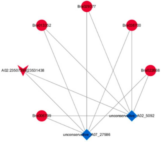 作者使用了TargetFinder來(lái)預(yù)測(cè)miRNA的靶基因,結(jié)合差異分析的結(jié)果最終得到170對(duì)miRNA和基因的調(diào)控關(guān)系,包含了18個(gè)miRNA和37個(gè)基因。對(duì)這些基因進(jìn)行GO富集分析,發(fā)現(xiàn)主要是細(xì)胞過(guò)程、代謝過(guò)程等功能。對(duì)構(gòu)建的網(wǎng)絡(luò)進(jìn)行研究發(fā)現(xiàn)miRNA所調(diào)控的基因主要是涉及糖代謝、脂質(zhì)代謝、花粉管生長(zhǎng)等,同時(shí)也發(fā)現(xiàn)這些miRNA與植物激素相關(guān),比如bra-miR9556-5p可能通過(guò)靶向Bra008715來(lái)參與水楊酸介導(dǎo)的信號(hào)通路和油菜素類固醇生物合成過(guò)程途徑。