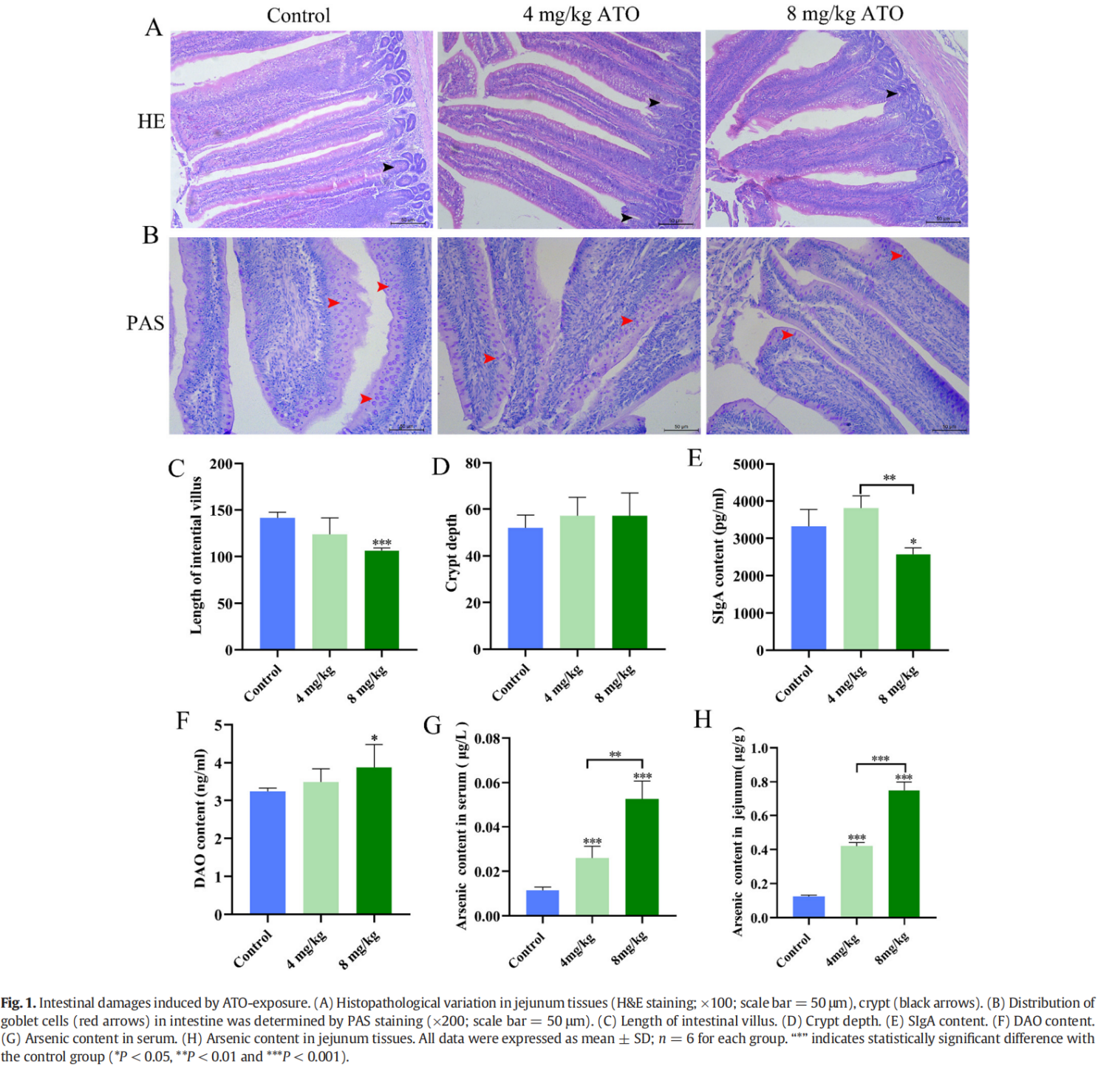 如圖?1G-H?所示,鴨空腸和血清中砷濃度呈劑量依賴性增加。與對(duì)照組相比,所有ATO治療組血清和空腸組織中砷含量均顯著升高(P < 0.001)。此外,8 mg/kg ATO?組的砷水平顯著高于?4 mg/kg ATO?治療組(P < 0.01?或?P < 0.001)。