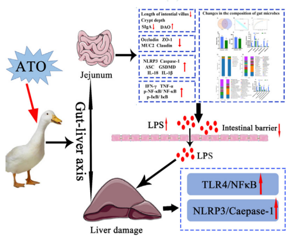 砷元素廣泛存在于自然界中,砷及砷化合物是常見(jiàn)的有毒有害類污染物,常見(jiàn)于受污染的土壤、河流和地下水中。然而,關(guān)于三氧化二砷?(ATO)?對(duì)水禽的腸-肝軸和隨之而來(lái)的肝毒性的影響的研究很少。在此,我們研究了?ATO?對(duì)鴨腸和肝臟的影響,并探討了腸肝軸在?ATO?誘導(dǎo)的肝毒性和腸道毒性中的作用。結(jié)果表明,ATO?暴露會(huì)導(dǎo)致腸道損傷、肝臟炎癥細(xì)胞浸潤(rùn)和囊泡脂肪變性。此外,暴露于?ATO?的鴨子的腸道微生物群落顯示出顯著降低的α多樣性和細(xì)菌群落的改變。并且,ATO?暴露顯著降低了腸道屏障相關(guān)蛋白(Claudin-1、MUC2、ZO-1?和?Occludin)的表達(dá),導(dǎo)致腸道通透性增加和脂多糖水平升高。同時(shí),ATO?暴露還上調(diào)肝臟和空腸中與細(xì)胞凋亡相關(guān)的指數(shù)水平,并增加促炎細(xì)胞因子的產(chǎn)生(IFN-γ、TNF-α、IL-18?和?IL-1β)。我們進(jìn)一步的機(jī)制研究表明,ATO?誘導(dǎo)的肝臟和空腸炎癥是由?LPS/TLR4/NF-κB?信號(hào)通路和?NLRP3?炎癥小體的激活引起的??傊?,這些結(jié)果表明ATO暴露可引起肝臟和空腸炎癥和細(xì)胞凋亡,間接腸肝軸通路可能在ATO誘導(dǎo)肝毒性的潛在機(jī)制中起重要作用