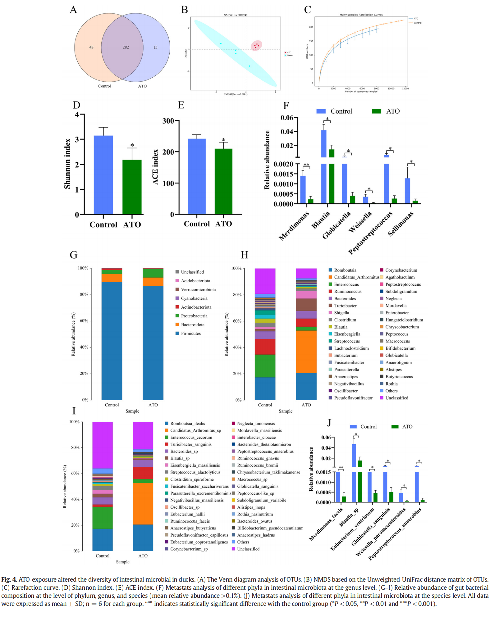 α?和?β?多樣性分析都用于評(píng)估對(duì)照組和?ATO?治療組之間腸道細(xì)菌群落多樣性的差異。如圖?4B?所示,NMDS?分析用于分析各組之間的?β-多樣性,ATO?治療組和對(duì)照組之間的腸道微生物群分布分別與每組聚類。此外,物種稀釋性曲線趨于相對(duì)平坦,說(shuō)明測(cè)序數(shù)量和深度符合后續(xù)分析的要求(圖4C)。腸道微生物種群的α多樣性通過(guò)群落豐度(ACE)和多樣性指數(shù)(香農(nóng)指數(shù))來(lái)反映。與對(duì)照組相比,ATO?暴露顯著降低了?ACE?和香農(nóng)指數(shù)(P < 0.05,圖?4D-E),這表明?ATO?暴露顯著改變了鴨腸道微生物的豐富度和多樣性。