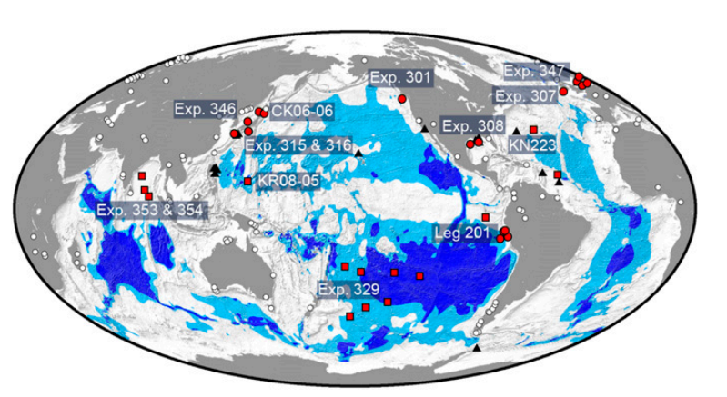 圖1 采樣地點(diǎn)的位置。紅色圓圈分別表示海洋邊緣站點(diǎn),紅色方塊分別表示開(kāi)放海洋站點(diǎn)。淺藍(lán)色和深藍(lán)色區(qū)域分別顯示整個(gè)沉積物中可能發(fā)生溶解氧和有氧活動(dòng)的最大和最小區(qū)域。在14次科學(xué)考察中,從40個(gè)地點(diǎn)采集了海底以下許多不同深度的299個(gè)沉積物樣本,用于比較不同全球海底沉積物微生物群落組成。