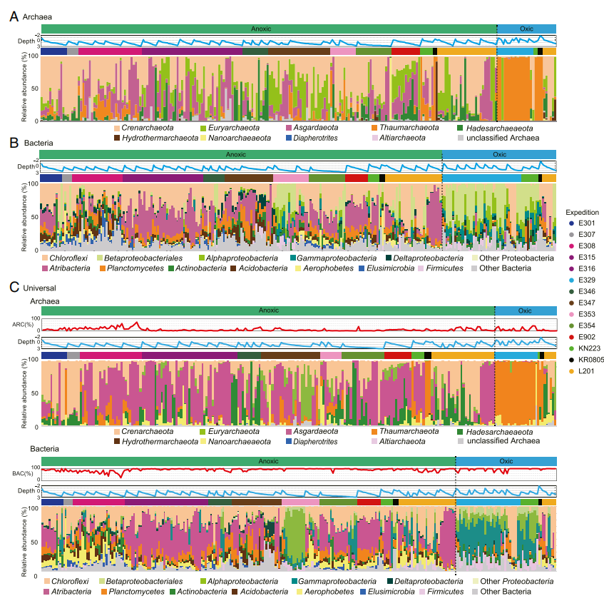 圖3 海洋沉積微生物群落的物種區(qū)系組成。(A)使用古菌特異性引物獲得的235個(gè)樣品的古菌群落組成。(B)使用細(xì)菌特異性引物獲得的272個(gè)樣品的細(xì)菌群落組成。(C)使用通用引物獲得的245個(gè)樣品的古菌群落組成和281個(gè)樣品的細(xì)菌群落組成,未顯示少于1,000條序列的樣本。淺藍(lán)色折線圖以對(duì)數(shù)刻度顯示沉積物深度。