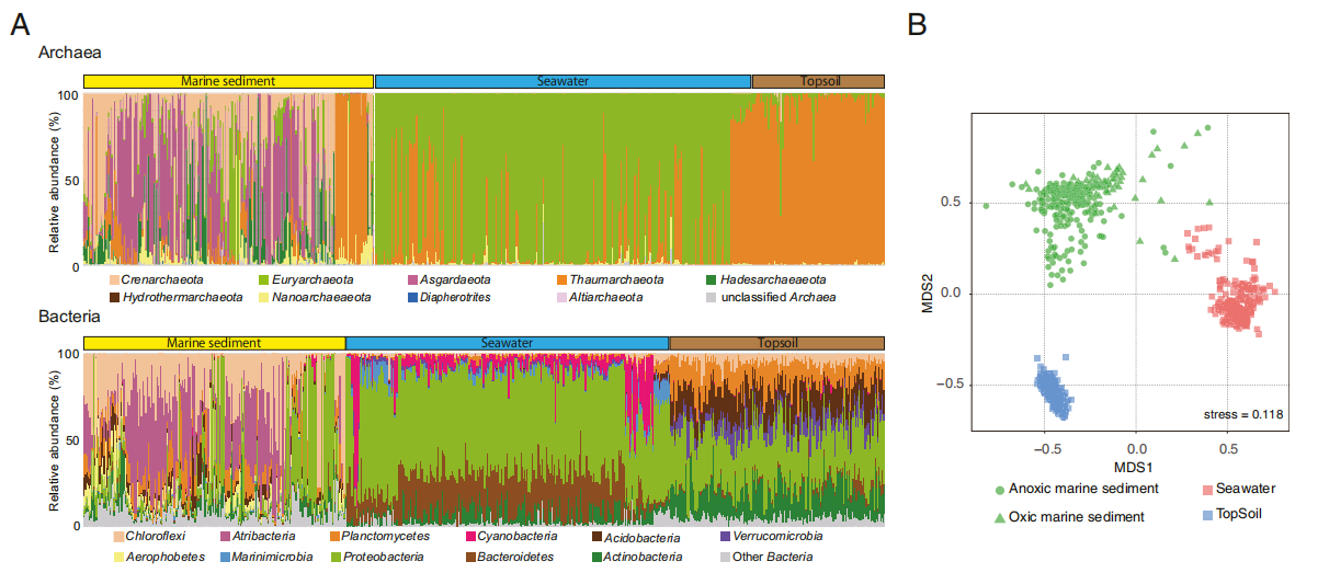 為了評(píng)估海洋沉積微生物群落與其他主要環(huán)境中微生物群落的關(guān)系,作者將海洋沉積物通用引物與使用相同通用引物的引物進(jìn)行微生物群落分析的海水和表層土壤的已發(fā)表序列進(jìn)行了比較。本研究中這三種生態(tài)環(huán)境的微生物群落中的細(xì)菌和古菌群落組成明顯不同(圖4)。如圖3所示,Crenarchaeota和Asgardaeota在海洋沉積物中占優(yōu)勢(shì),而Euryarchaeota和Thaumarchaeota在海水中占優(yōu)勢(shì),而Thaumarchaeota在表層土壤中占優(yōu)勢(shì)。細(xì)菌群落組成表明變形桿菌在表層土壤和海洋中占據(jù)優(yōu)勢(shì)。此外,Cyanobacteria,Marinimicrobia和Bacteroidetes在海水中占主導(dǎo)地位,而Acidobacteria和Verrucomicrobia在表層土壤中更為重要。在海洋沉積物中普遍存在著Atribacteria和Aerophobetes,但其他兩個(gè)環(huán)境中卻沒(méi)有這些細(xì)菌,這表明海洋沉積微生物構(gòu)成了一個(gè)獨(dú)特的生物群落。ASV組成的樣品間相似性表明這三個(gè)生物群落中的群落不同(圖4B),海洋沉積物中樣品間的多樣性更高。與其他環(huán)境相比,這種高多樣性可能反映了海洋沉積物棲息地條件的劇烈變化。