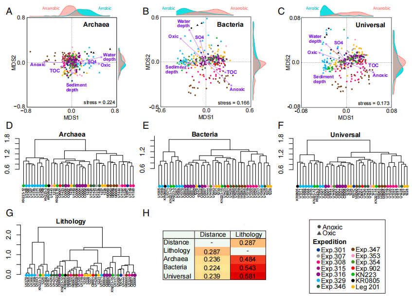 圖5 海洋沉積物微生物群落的β多樣性。(A–C)使用Jaccard相似性指數(shù)值生成的古菌(A),細(xì)菌(B)和通用引物數(shù)據(jù)集的NMDS排序圖。紫色箭頭表示與特征為P <0.01的環(huán)境因子相符的向量。(D–F)基于Jaccard相似性指數(shù)值,分別對(duì)40個(gè)地點(diǎn)的古菌(D),細(xì)菌(E)和通用引物數(shù)據(jù)集(F)進(jìn)行算術(shù)平均(UPGMA)樹(shù)狀圖的非加權(quán)成對(duì)分組法。(G)基于40處沉積物的礦物成分的UPGMA巖性樹(shù)狀圖。(H)確定地理距離或巖性是否與微生物群落組成相關(guān)。
