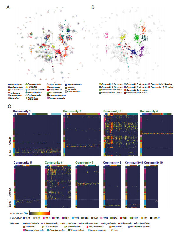 為了確定共現(xiàn)模式,作者基于使用通用引物獲得的ASV的Spearman相關(guān)性進(jìn)行了網(wǎng)絡(luò)分析(r> 0.6,P <0.05;圖6)。生成的網(wǎng)絡(luò)圖包含1,533個(gè)節(jié)點(diǎn)(ASV),網(wǎng)絡(luò)的模塊化程度很高(0.84)。在圖6B中,僅顯示了10個(gè)最大的模塊,其中5個(gè)群落在有氧環(huán)境中普遍存在的模塊(群落1、5、8、9和10)和五個(gè)在缺氧沉積物中普遍存在的ASV組成的模塊(群落2、3、4、6和7)。在這10個(gè)群落中,群落1包含最多數(shù)量的ASV(84個(gè)ASV),主要由Chloroflexi、Proteobacteria和Thaumarchaeota組成(圖6C)。網(wǎng)絡(luò)圖顯示,Chloroflexi和Thaumarchaeota是共現(xiàn)網(wǎng)絡(luò)的重要成員(圖6A)。在五個(gè)缺氧沉積物群落中,群落3主要由Atribacteria、Chloroflexi和Planctomyces組成。網(wǎng)絡(luò)分析表明Chloroflexi是海洋沉積物環(huán)境中重要的微生物組成。但是,幾乎所有Chloroflexi都與MSBL9相關(guān)聯(lián),有報(bào)道表明MSBL9適合利用多種復(fù)雜的糖聚合物。簡(jiǎn)而言之,共生網(wǎng)絡(luò)分析表明,海洋沉積物微生物群落組成受沉積物中氧化還原態(tài)和電子供體的影響。該分析結(jié)果還表明,海底沉積微生物彼此相互作用,以有效利用這種極端環(huán)境中可用的有限基質(zhì)。