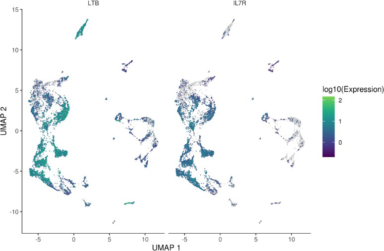 ?plot_cells(monocle_cds, genes=c(“LTB”, “IL7R”)) # 顯示某幾個(gè)基因的表達(dá)