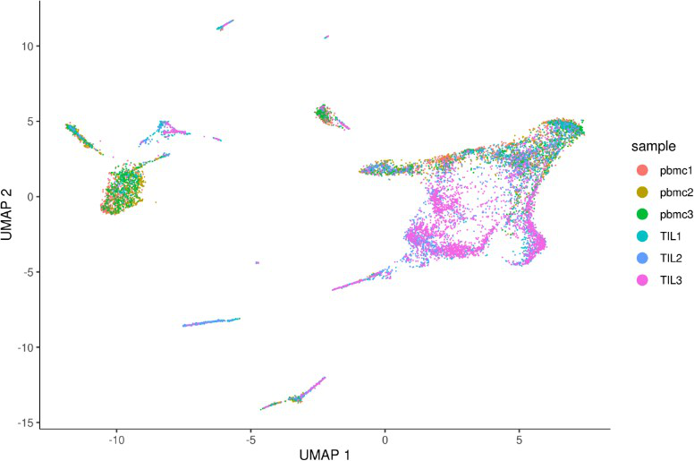 plot_cells(monocle_cds, color_cells_by=”sample”, label_cell_groups=FALSE) # 檢查樣本間的批次效應(yīng)