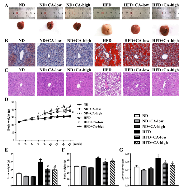 ? ? ? ?本研究旨在評(píng)估CA治療高脂喂養(yǎng)小鼠的潛在益處,重點(diǎn)關(guān)注在NAFLD發(fā)病機(jī)制中,除了調(diào)節(jié)內(nèi)毒素相關(guān)炎癥信號(hào)機(jī)制和脂代謝改變外,恢復(fù)腸道菌群平衡可能與之有關(guān)。為了研究CA對(duì)脂質(zhì)積累的影響,我們分別用低濃度和高濃度的CA喂養(yǎng)小鼠。肝脂肪變性是主要的組織病理學(xué)表現(xiàn);在其他研究中觀察到,高脂飼料喂養(yǎng)小鼠的肝臟比三組ND小鼠的肝臟出現(xiàn)更多的脂肪變性,宏觀上黃色和堅(jiān)硬的紋理證明了這一點(diǎn)(圖1A)。值得注意的是,添加0.08%或0.16% CA的HFD小鼠肝臟表面呈紅褐色,質(zhì)地柔軟。肝切片HE染色(圖1B)和油紅O染色(圖1C)證實(shí)了這一點(diǎn)。與ND組相比,高脂飼料喂養(yǎng)的小鼠脂肪滴更多、更大,而CA處理的小鼠脂肪滴更少。與ND組相比,HFD干預(yù)8周后小鼠體重顯著增加,并持續(xù)增加至16周。然而,從第8周開始,飼糧中添加0.08%或0.16%的CA可以有效地緩解hfd誘導(dǎo)的體重增加,特別是在第14周(CA濃度均為)和第16周(僅添加0.08% CA)時(shí)(圖1D)。在肝臟重量(圖1E)、體重(圖1F)和肝臟/體重(圖1G)以及兩種濃度的CA處理中也可以觀察到類似的結(jié)果,這降低了hfd誘導(dǎo)的肝臟重量、體重和肝臟/體重的增加。與只喂食ND組相比,添加CA的ND組對(duì)這些指標(biāo)沒有任何差異。
