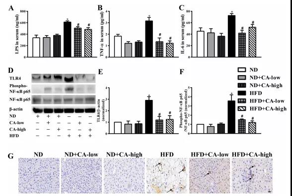 有報(bào)道稱,NAFLD的特征是腸道菌群改變、炎癥和腸道屏障破壞。肝組織炎癥被認(rèn)為是肝脂肪變性發(fā)展的驅(qū)動(dòng)因素,腸道源性脂多糖被認(rèn)為在肝臟炎癥中具有致病作用。最近的動(dòng)物實(shí)驗(yàn)研究關(guān)注了腸道菌群LPS在NAFLD發(fā)生中的作用。腸道源性LPS是革蘭氏陰性菌外膜的主要成分,通過TLR4信號(hào)通路和下游炎癥級(jí)聯(lián)反應(yīng)促進(jìn)炎癥反應(yīng)。有報(bào)道稱,在NAFLD模型中,與野生型小鼠相比,tlr4缺陷小鼠的肝損傷、炎癥和脂質(zhì)積累減少。此外,阻斷腸道菌群與宿主細(xì)胞之間的脂多糖- tlr4相互作用可以阻止高脂喂養(yǎng)小鼠NAFLD的啟動(dòng)和發(fā)展,這證實(shí)了脂多糖- tlr4通路在誘導(dǎo)NAFLD中具有非常重要的作用。與之前的研究結(jié)果一致,我們的研究表明,16周高脂飲食導(dǎo)致血清LPS和肝臟TLR4表達(dá)顯著增加,肝組織中磷酸化的NF-kB p65被激活,表明炎癥開始。同時(shí),高脂喂養(yǎng)小鼠血清TNF-a、IL-6水平升高,肝臟mpo陽性細(xì)胞浸潤。所有劑量的CA補(bǔ)充均顯著扭轉(zhuǎn)了上述現(xiàn)象;在添加ca的ND組中沒有觀察到顯著差異(圖4A-G)。