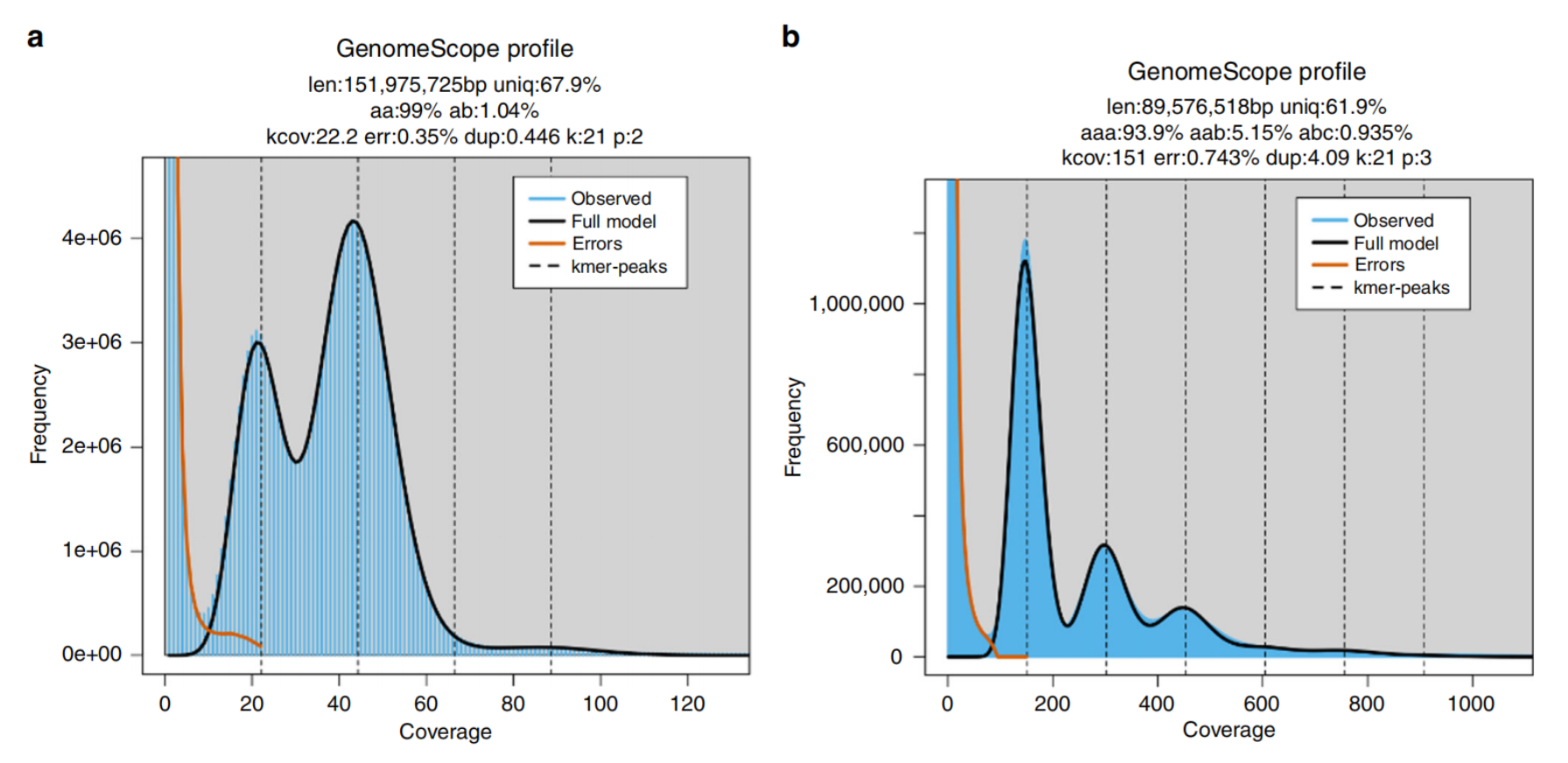 ? ? ? ?但僅知道物種大小是遠(yuǎn)遠(yuǎn)不夠的,現(xiàn)在為了完成更高質(zhì)量基因組組裝通常需要選擇不同類型的材料。例如為了構(gòu)建0?Gap的高連續(xù)性基因組,會(huì)選擇超高純合度的材料(通過自交純合或是花藥培養(yǎng)等)來降低組裝中的障礙。亦或是為了完成二倍體基因組雙單倍體的組裝,選擇超高雜合度的材料(例如遠(yuǎn)緣雜交或是野生材料篩選等)來增加基因組中同源對的差異,從而進(jìn)行區(qū)分與組裝。