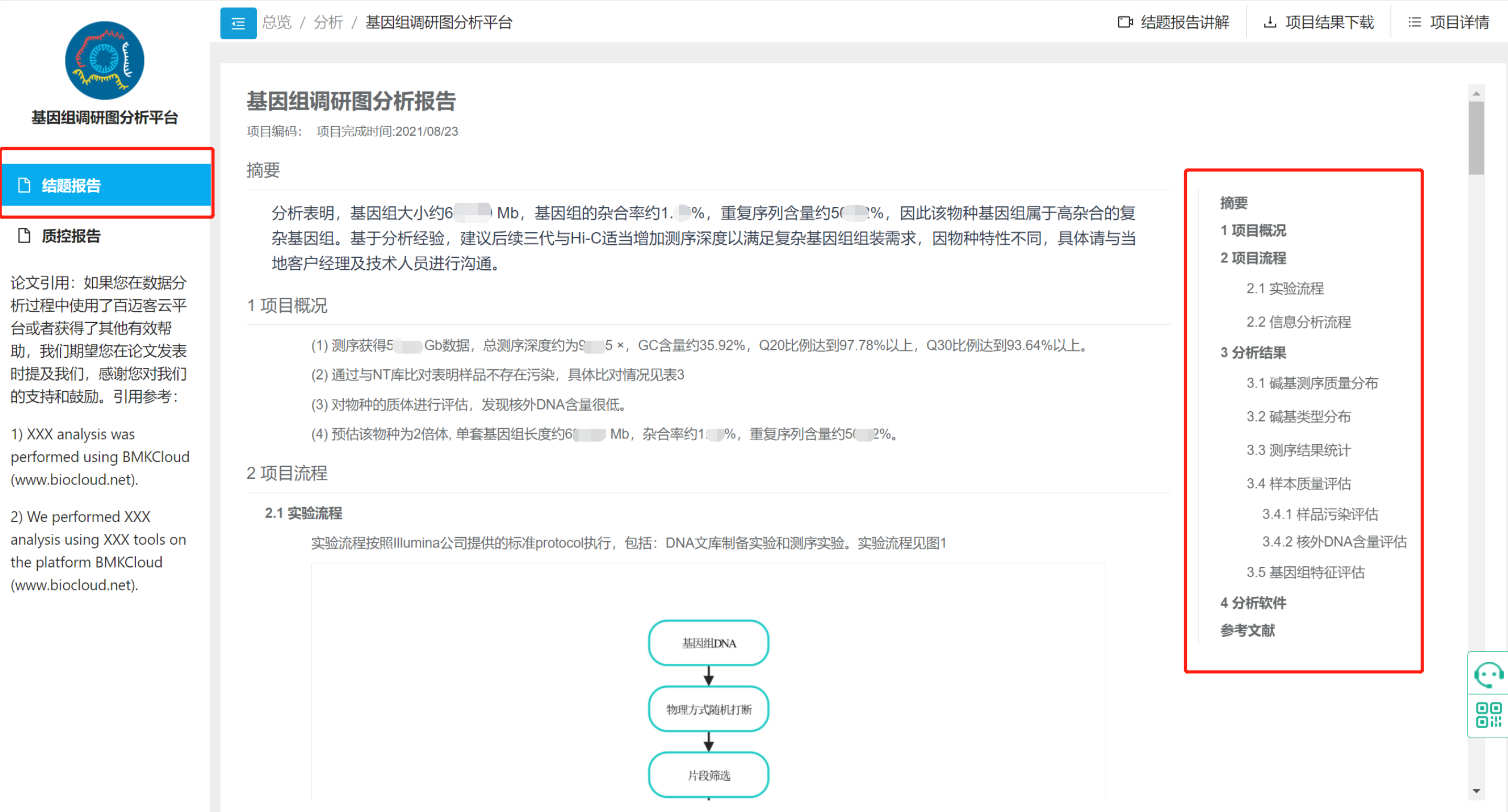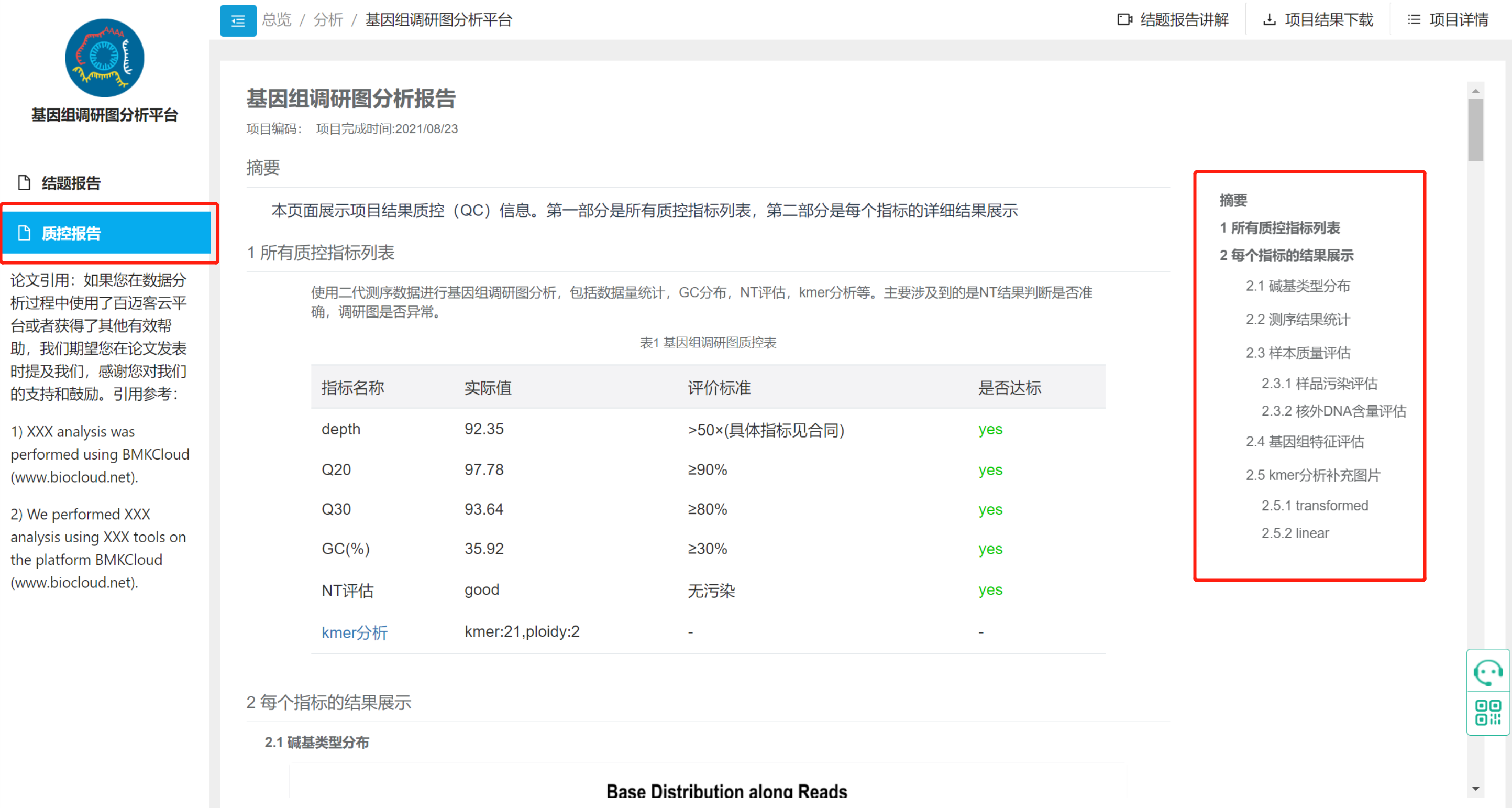 分析完成即可在線查看項(xiàng)目結(jié)題報(bào)告與數(shù)據(jù)質(zhì)控報(bào)告。報(bào)告將對整體數(shù)據(jù)質(zhì)量、污染評估、基因組特征、使用軟件版本等進(jìn)行詳細(xì)描述。具體可見下圖右部目錄。