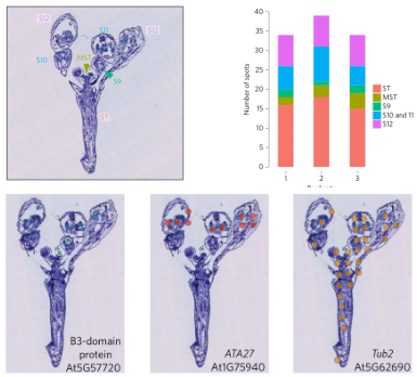 擬南芥花苞中空間轉(zhuǎn)錄組檢測莖、分生組織、以及3個(gè)不同花區(qū)域空間基因表達(dá),一共檢測到20215個(gè)基因,鑒定開花有關(guān)的兩個(gè)關(guān)鍵基因At5g57720(已知的在S3和S9表達(dá)的基因)和 ATA27 (At1g75940,已知的在S11和S12表達(dá)的基因)的√確的空間定位可視化,組織區(qū)域特異性基因和通路的顯著差異,發(fā)現(xiàn)雄蕊絲發(fā)育通路在S11(雄蕊絲伸長的位置)和莖中富集,在莖中維管通道大量存在,并且細(xì)胞伸長和維管發(fā)育過程非?;钴S。其中花粉外壁形成途徑在S10和S11發(fā)生改變,在這個(gè)階段,外壁是花粉壁的主要組成部分之一,在絨氈層產(chǎn)生并沉積在花粉前細(xì)胞上??臻g基因表達(dá)特征揭示了組織區(qū)域異質(zhì)性,并為植物生長發(fā)育過程和相應(yīng)功能的探索提供了高分辨率的空間植物基因表達(dá)模式,從新的維度探索植物發(fā)育過程。
