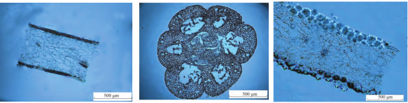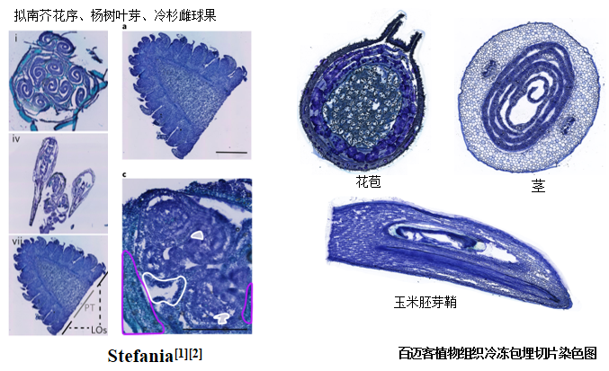 動(dòng)物組織常用HE(蘇木精-伊紅染色法 ( hematoxylin-eosin staining ))染色,可以精準(zhǔn)識別組織形態(tài)和病理學(xué)鑒定。然而植物的組織存在的纖維素和一些木質(zhì)素不適合HE染色方法,采取的是甲苯胺藍(lán)染色法,其基本原理是植物組織木質(zhì)化細(xì)胞壁呈藍(lán)綠色,其他組織成分呈紫藍(lán)色,可以精準(zhǔn)輔助判斷植物組織形態(tài)學(xué)和確定捕獲區(qū)域。