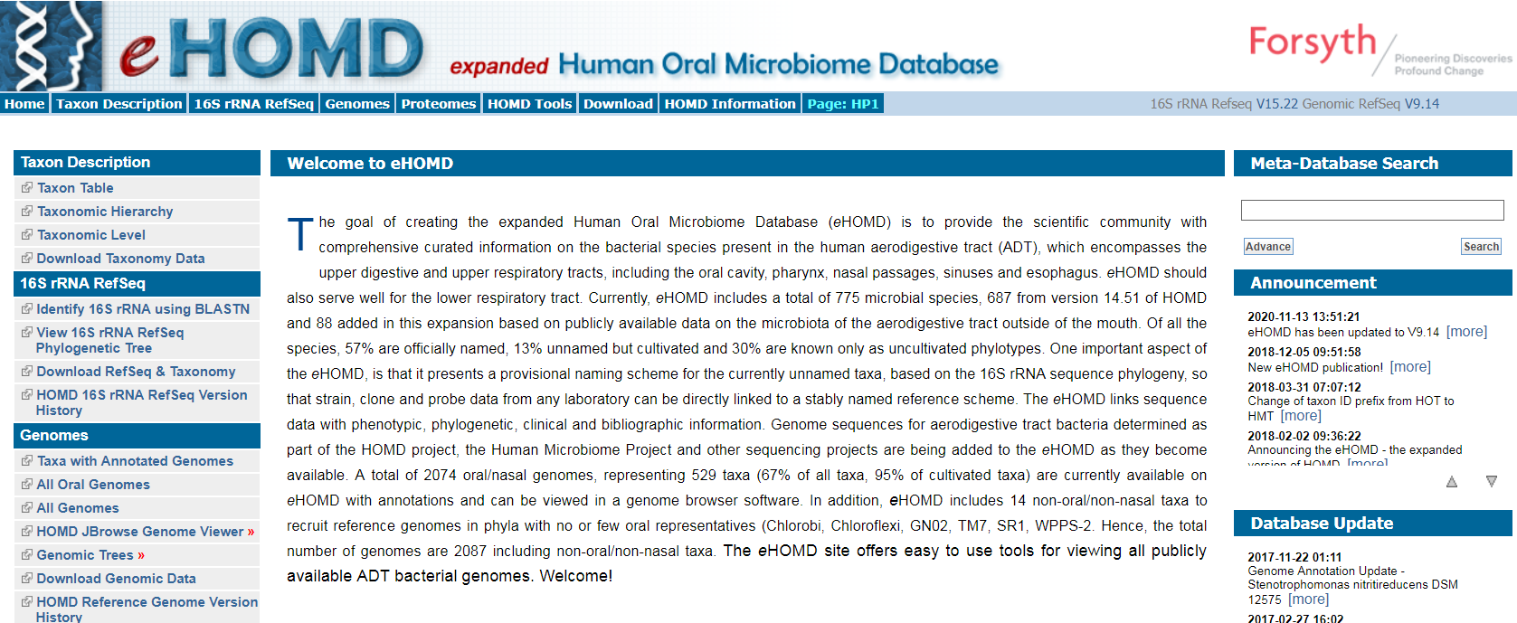 3.人類口腔微生物組數(shù)據(jù)庫(eHOMD):http://www.homd.org/