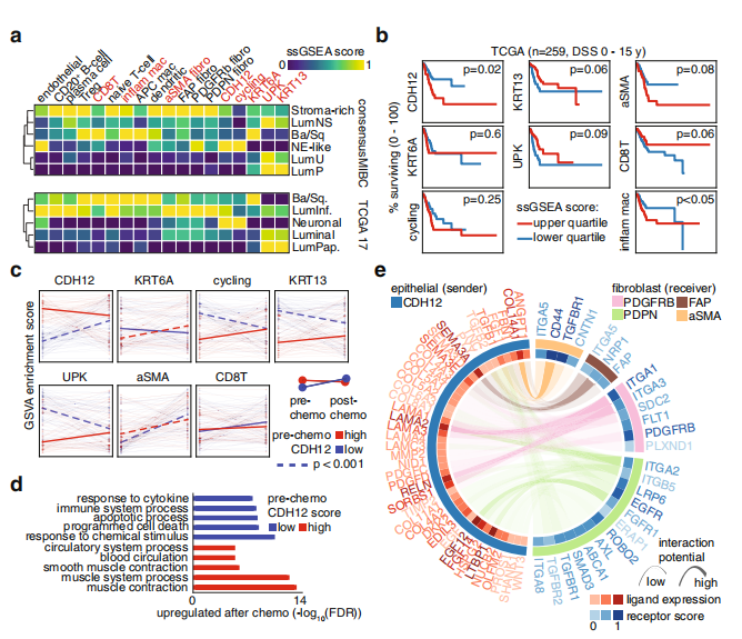 術(shù)前新輔助化療(NAC)和免疫檢查點(diǎn)治療(ICT)已經(jīng)徹底改變了膀胱癌的治療。然而,從這些模式中獲益最多的患者分層仍然是一個(gè)主要的臨床挑戰(zhàn)。作者將人類膀胱癌的單細(xì)胞核轉(zhuǎn)錄組、空間轉(zhuǎn)錄組和單細(xì)胞分辨率的空間蛋白組聯(lián)合分析,確定具有治療反應(yīng)預(yù)測能力的上皮細(xì)胞亞群。這些細(xì)胞表達(dá)Cadherin12(CDH12,N-Cadherin 2?)、catenins和其他上皮細(xì)胞的標(biāo)志物。CDH12富集的腫瘤可以定義患者是否接受NAC治療后預(yù)后效果差。富集CDH12的腫瘤對(duì)ICT表現(xiàn)出更好的效果。在所有情況下,通過對(duì)腫瘤CDH12富集進(jìn)行患者分層比目前膀胱癌亞型能更好的預(yù)后預(yù)測。CDH12群體類似于一種未分化的狀態(tài),具有固有的侵略性生態(tài)學(xué),包括化學(xué)耐藥性可能是通過祖細(xì)胞樣基因表達(dá)和成纖維細(xì)胞激活介導(dǎo)的。CDH12富集細(xì)胞表達(dá)PD-L1和PD-L2以及耗竭T細(xì)胞共定位,可能通過CD49a(ITGA1)介導(dǎo),為ICT在腫瘤中的功效提供一種解釋??傊?,本研究描述了一個(gè)對(duì)膀胱癌治療具有反向應(yīng)答的癌細(xì)胞群。重要的是還為臨床標(biāo)志物的篩選提供了一個(gè)令人信服的框架。