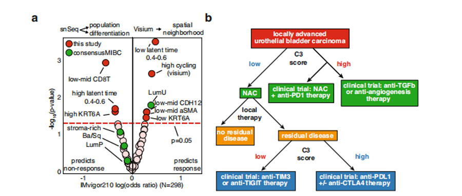 膀胱癌患者接受免疫治療后預(yù)后效果的好壞仍然是臨床上面臨的一個(gè)主要的挑戰(zhàn)。近期NC一篇文章通過單細(xì)轉(zhuǎn)錄組及空間轉(zhuǎn)錄組闡述了對(duì)膀胱癌治療具有反應(yīng)應(yīng)答的癌細(xì)胞群。獲得了在預(yù)測對(duì)免疫治療的反應(yīng)方面更優(yōu)的marker基因。有助于為患者的治療提供更理想更優(yōu)的治療方案。