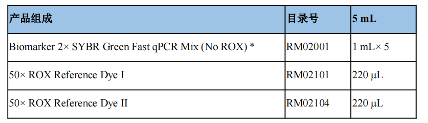 Biomarker 2× SYBR Green Fast qPCR Mix采用SYBR? Green I 嵌合熒光法進(jìn)行qPCR反應(yīng),通過對SYBR? / FAM通道進(jìn)行熒光信號定量檢測,可以獲得PCR過程中DNA擴(kuò)增的真實數(shù)據(jù)。Taq DNA酶采用抗體法熱啟動進(jìn)行擴(kuò)增,可以有效抑制引物退火導(dǎo)致的非特異性擴(kuò)增,極大地提高產(chǎn)品的特異性。且試劑盒中含有特殊的ROX Reference Dye,適用于所有qPCR儀器。