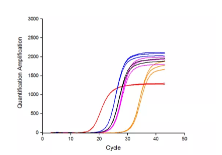 圖3:以1 μg不同物種的RNA為模板(紅色:人肝癌細(xì)胞;藍(lán)色:雞;黑色:斑馬魚;紫色:水稻種子;黃色:番茄果),用BiomarkerScript Ⅱ 1st Strand cDNA Synthesis Kit進(jìn)行逆轉(zhuǎn)錄,得到cDNA產(chǎn)物。再以100 ng不同物種的 cDNA為模板,用Biomarker 2×SYBR Green Fast qPCR Mix進(jìn)行qPCR擴(kuò)增。