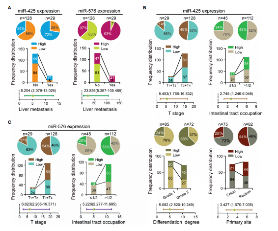 為了探討miR-425和miR-576在CRLM患者中的臨床價值,作者分析了miR-425和miR-576與環(huán)境因素或病理變量包括年齡、性別、家族史、T分期、樣本量、腸道占位、分化、血管浸潤、原發(fā)部位和肝轉(zhuǎn)移。頻率分布和校正后的回歸分析顯示,miR-425和miR-576高表達(dá)均在肝轉(zhuǎn)移患者組織中頻繁分布(圖2A)。此外,miR-425過表達(dá)與CRC患者晚期T期、腸道占位、分化程度和原發(fā)性直腸相關(guān)(圖2B)。增加miRNA的表達(dá)是滲透到漿膜和廣泛占用腸道的一個促進(jìn)因素(圖2C)。
