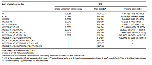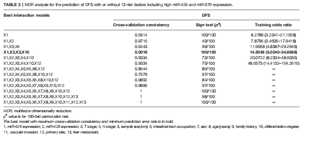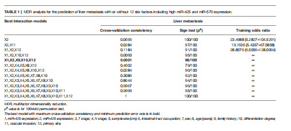 MDR分析顯示,miR-425、miR-576與家族病史、分化程度、原發(fā)部位聯(lián)合使用是評估肝轉(zhuǎn)移風(fēng)險的最佳預(yù)測模型,其交叉驗證一致性(CVC)最高,預(yù)測誤差最小(表1)。這些結(jié)果提示miR-425和miR-576高水平的CRC患者特別容易發(fā)生肝轉(zhuǎn)移。