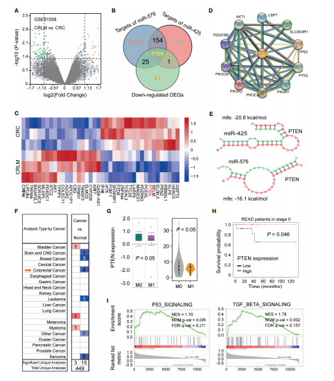 為了闡明miR-425和miR-576介導(dǎo)肝轉(zhuǎn)移和不良預(yù)后的有意義的下游靶點(diǎn),作者在GSE81558 (n = 6)數(shù)據(jù)集上繪制火山圖,分析CRC組織和癌旁組織之間的DEGs(圖4A)。PTEN是CRLM中顯著下調(diào)基因與miR-425和miR-576靶基因的交集(圖4B)。聚類熱圖顯示在CRLM中PTEN的下調(diào)最顯著(圖4C)。進(jìn)一步檢索STRING發(fā)現(xiàn)與PTEN互作的關(guān)鍵蛋白(圖4D)。配對序列間的有效MFEs分別為?20.8和?16.1 kcal/mol(圖4E)。進(jìn)一步分析發(fā)現(xiàn),基于TCGA數(shù)據(jù)庫PTEN在幾種類型的腫瘤中表達(dá)顯著下調(diào)(圖4F),PTEN表達(dá)越低易發(fā)生腫瘤轉(zhuǎn)移且預(yù)后越差(圖4G和H)。此外,基于GSE62321 (n = 26)數(shù)據(jù)集,PTEN與miR-425和miR-576一致,證實PTEN正向參與P53、TGF-β信號通路,在腫瘤轉(zhuǎn)移中發(fā)揮有意義的作用(圖4I)。這些結(jié)果表明,PTEN下調(diào)是CRLM中miR-425和miR-576的共同靶點(diǎn),導(dǎo)致臨床結(jié)果不佳。