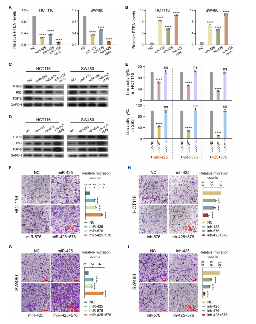 接下來,作者證明了miR-425和miR-576通過負(fù)調(diào)控PTEN-P53/TGF-β軸,在細(xì)胞學(xué)水平上通過敲低和過表達(dá)功能實驗確定了其誘導(dǎo)CRC轉(zhuǎn)移的發(fā)生。QPCR檢測發(fā)現(xiàn),在HCT116和SW480細(xì)胞系中,這兩種miRNA的過表達(dá)均導(dǎo)致PTEN mRNA表達(dá)明顯抑制(圖5A)。MiR-425和miR-576的缺失顯著增強(qiáng)了PTEN mRNA的表達(dá)(圖5B)。WB試驗證實PTEN蛋白的變化一致,P53和TGF-β也是如此(圖5C和D)。正如預(yù)期的那樣,結(jié)果顯示miR-425和miR-576顯著抑制WT熒光素酶基因表達(dá)強(qiáng)度,然而在Mut基因上沒有觀察到明顯的變化表明PTEN 3’UTR與miR-425和miR-576之間存在直接的結(jié)合模式(圖5E)。此外miR-425和miR-576的高表達(dá)顯著促進(jìn)了HCT116和SW480細(xì)胞的遷移能力分,反之亦然(圖5F-I)。綜上所述,miR-425和miR-576直接靶向PTEN介導(dǎo)的P53/TGF-β信號通路,參與了CRLM過程中細(xì)胞遷移的促進(jìn)。