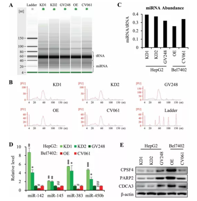 為了測試CPSF4介導的circRNA減少是否會影響miRNA的穩(wěn)定性,從CPSF4-OE和CPSF-KD細胞中提取總miRNA,結(jié)果顯示CPSF4-OE細胞中miRNA(4-40 nt)和tRNA(40-80 nt)的比率降低,但在CPSF4-KD細胞中增加(圖 3A-C),這證實了CPSF4能夠減少miRNA的積累。