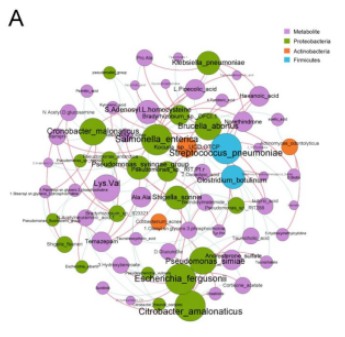 主要結(jié)果:慢性阻塞性肺疾病(COPD)是全球第三常見的死亡原因,表現(xiàn)為一種持續(xù)炎癥性肺部疾病,沒有根治方法。肺部微生物群促進了COPD的發(fā)展,但腸道微生物群的功能仍不清楚。在該研究中,研究者比較了COPD患者和健康對照組的糞便微生物組和代謝組,發(fā)現(xiàn)146種細(xì)菌在兩組之間存在差異。運用非靶向代謝組學(xué)鑒定出COPD的特征包括46%的脂質(zhì)、20%的異型生物質(zhì)和20%的氨基酸相關(guān)代謝物,通過相關(guān)性分析,構(gòu)建了Streptococcus parasanguinis_B與COPD疾病相關(guān)代謝產(chǎn)物之間的相關(guān)網(wǎng)絡(luò),COPD患者的糞便微生物組和代謝組與健康人不同,可能有助于尋找COPD的生物標(biāo)志物。