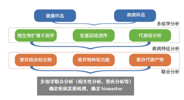 ?微生物組測序(主要指擴增子測序與宏基因組測序)可提供微生物組成、基因功能和豐度信息,而代謝組學(xué)是研究生物體中代謝產(chǎn)物變化的科學(xué)。生物科學(xué)研究過程復(fù)雜,單—組學(xué)往往無法全面的解決生物學(xué)問題,多組學(xué)就顯得尤為重要。近年來,隨著微生物組學(xué)研究的不斷發(fā)展和持續(xù)火熱,越來越多的研究者開始將微生物組學(xué)和代謝組學(xué)聯(lián)合起來,從物種、基因以及代謝產(chǎn)物等水平共同解釋科學(xué)問題,更好地理解疾病過程及機體內(nèi)物質(zhì)的代謝途徑,還有助于發(fā)現(xiàn)疾病的生物標(biāo)記以更進—步應(yīng)用千臨床輔助診斷。