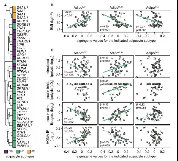 ? ? ? ??接下來(lái),作者的目標(biāo)是了解脂肪細(xì)胞亞型對(duì)組織功能的貢獻(xiàn)。為深入了解脂肪細(xì)胞亞型方面的功能,作者對(duì)56女性的WAT轉(zhuǎn)錄組數(shù)據(jù)進(jìn)行了綜合分析,其中還對(duì)新鮮分離的脂肪細(xì)胞進(jìn)行了脂肪分解/脂肪生成測(cè)量。在比較56名女性數(shù)據(jù)時(shí),Adipo PLIN、Adipo LEP和Adipo SAA標(biāo)記基因形成了單獨(dú)的、共同調(diào)控的集群(圖6A),可用來(lái)確定細(xì)胞類型豐度和脂肪細(xì)胞表型之間的關(guān)系。與空間數(shù)據(jù)一致 ,Adipo PLIN在肥胖人群中的比例降低,分析顯示Adipo PLIN與BMI之間負(fù)相關(guān),AdipoSAA與BMI也呈負(fù)相關(guān),而AdipoLEP呈正相關(guān)(圖6B)。
