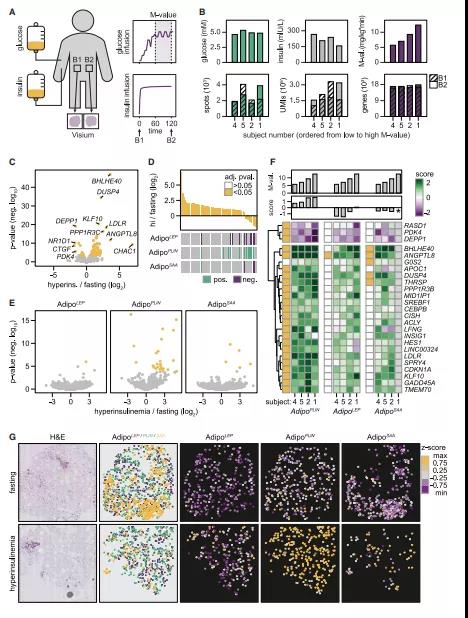 ? ? ? ??在脂肪細(xì)胞中,兒茶酚胺刺激脂肪分解,胰島素抑制脂肪分解促進(jìn)脂肪生成。通過(guò)校正BMI(圖6c),作者觀察到AdipoPLIN和兩種脂解指標(biāo)之間存在正相關(guān),而AdipoLEP與這些參數(shù)沒(méi)有或弱負(fù)相關(guān)。對(duì)于胰島素刺激脂肪生成,研究發(fā)現(xiàn)Adipo PLIN與此指標(biāo)呈正相關(guān),AdipoLEP呈負(fù)相關(guān)。相比之下,AdipoSAA與任何研究參數(shù)均無(wú)顯著相關(guān)性。總之,這表明Adipo PLIN與AdipoSAA相比,Adipo PLIN與更明顯的胰島素反應(yīng)有關(guān)。為了在人體內(nèi)測(cè)試這一發(fā)現(xiàn),作者在高胰島素-微生物-正血糖鉗夾2小時(shí)后,從10個(gè)個(gè)體中的4個(gè)收集了 WAT樣本,并進(jìn)行了空間轉(zhuǎn)錄組分析(圖7A,7B)。穩(wěn)定狀態(tài)下的胰島素平均濃度是空腹?fàn)顟B(tài)下的10倍,從葡萄糖處理率(m值)可以看出,4例患者均表現(xiàn)出明顯的胰島素敏感性(圖7B)。高胰島素血癥的空間數(shù)據(jù)與禁食狀態(tài)下獲得的樣本質(zhì)量相似(圖7B),兩者的比較在基因表達(dá)水平上明確了胰島素反應(yīng)(圖7C)。這些數(shù)據(jù)與之前報(bào)道的高胰島素鉗夾隊(duì)列的大量組織RNA測(cè)序顯示出一致的結(jié)果,表明空間分析捕捉到了胰島素的急性反應(yīng)。盡管胰島素誘導(dǎo)了一個(gè)快速的轉(zhuǎn)錄反應(yīng),但在這個(gè)時(shí)間框架內(nèi),它本身并不是脂肪細(xì)胞異質(zhì)性的驅(qū)動(dòng)因素(圖7D)。接下來(lái),作者根據(jù)細(xì)胞類型進(jìn)行胰島素反應(yīng)分析。對(duì)于脂肪細(xì)胞,在AdipoPLIN中有多個(gè)基因?qū)σ葝u素有顯著反應(yīng),AdipoSAA中變少,而AdipoLEP中只有一個(gè)基因(圖7E)。作者評(píng)估了個(gè)體間對(duì)胰島素的轉(zhuǎn)錄反應(yīng)是否存在數(shù)量差異,分析結(jié)果表明,Adipo PLIN反映了 M-values值,但這在其他兩個(gè)亞型中不明顯(圖7F和7G)??傊?,這些數(shù)據(jù)表明,體內(nèi)對(duì)胰島素的轉(zhuǎn)錄反應(yīng)主要?dú)w因于Adipo PLIN,而其他脂肪細(xì)胞亞型對(duì)高胰島素血癥仍然沒(méi)有反應(yīng)。