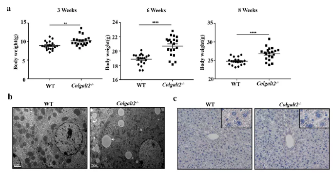 通過肝組織的PCR和western blotting,結(jié)果顯示Colgalt2?/?小鼠中不表達(dá)COLGALT2。在3,6,8周齡時(shí)分別對(duì)Colgalt2?/?和WT小鼠稱重,結(jié)果顯示Colgalt2敲除增加了小鼠的體重(圖1a)。通過透射電鏡觀察發(fā)現(xiàn),6周齡Colgalt2?/?小鼠肝細(xì)胞中有脂滴聚集(圖1b)。然而,在6-8 周齡時(shí),WT小鼠和Colgalt2?/?小鼠的肝油紅O染色和TG含量沒有明顯差異(圖1c)。