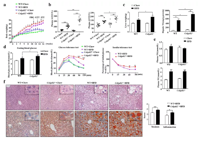 2、在HFD喂養(yǎng)的小鼠中發(fā)現(xiàn)Colgalt2敲除增加肝臟脂肪變性和胰島素抵抗