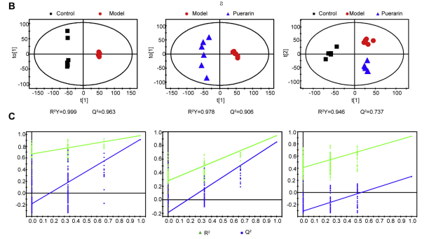 圖3A和圖4a顯示了小鼠肝臟組織和尿液的代表性1H NMR譜圖。為了研究NASH對小鼠代謝紊亂的影響,基于小鼠肝組織和尿液樣本的歸一化核磁共振波譜數(shù)據(jù),計算PCA和OPLS-DA模型,揭示葛根素的干預作用。觀察到對照組和模型組之間肝臟和尿代謝表型的清晰分離(圖3B, 4b和S1),表明MCD飲食誘導小鼠NASH后發(fā)生了一些顯著的生化變化。此外,PCA 和 OPLS-DA 得分圖揭示肝臟和泌尿代謝的完全分化模型和葛根素組之間的概況以及顯示葛根素組有恢復到健康對照組的趨勢,這可能歸因于葛根素對NASH的治療效果。兩個模型參數(shù)R2Y 和 Q2 以及置換測試的結果說明了OPLS-DA 模型的有效性(圖 3C 和 4C)。