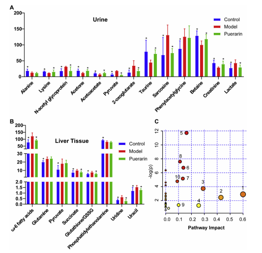 基于來自 OPLS-DA 模型的 VIP 值(VIP ≥ 1)和來自單變量統(tǒng)計分析的 P 值 (P < 0.05),8 和 13顯著改變與 NASH 相關的內(nèi)源性代謝物是分別被鑒定為肝組織和尿液中的潛在生物標志物(圖 5A 和 B,以及表 1)。肝臟代謝特征NASH 模型小鼠的 w-6 脂肪酸水平升高,谷氨酰胺、丙酮酸、琥珀酸、谷胱甘肽/GSSG、尿苷和尿嘧啶,連同的磷脂酰乙醇胺水平降低。關于健康控制與對照組相比,模型組尿中n -乙酰糖蛋白(NAG)、丙酮酸、2-氧戊二酸、肌氨酸、苯乙酰甘氨酸、乳酸水平升高,丙氨酸、賴氨酸、丙酮、乙酰乙酸、?;撬?、甜菜堿、肌酐水平降低。此外,除了肝臟組織中的谷氨酰胺、丙酮酸和磷脂酰乙醇胺(PE)以及尿液中的丙氨酸和苯乙酰甘氨酸外,所有與NASH相關的潛在生物標志物均被葛根素顯著逆轉(zhuǎn)。