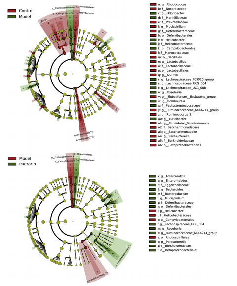 門水平的分類分析表明,厚壁菌門、擬桿菌門和放線菌門在所有類群的糞便微生物群落中占優(yōu)勢。與對照組相比,模型組的Epsilonbacteraeota水平較高,而葛根素處理可逆轉(zhuǎn)這一趨勢(圖7D)。采用LEfSe方法,篩選出LDA評分大于2.0的明顯改變的類群,以鑒定類群間(門到屬)的差異類群。如圖8和圖9所示,在對照組和模型組之間,模型和葛根素組之間,共發(fā)現(xiàn)了40和24個不同的細菌分類分支。有趣的是,在葛根素治療后,14種不同的細菌類群在NASH小鼠中顯示出相同的恢復正常水平的趨勢,包括p Epsilonbacteraeota, c Campylobacteria、o彎曲菌目、 f 螺桿菌科、 g幽門螺桿菌屬、p 脫鐵桿菌門、c 脫鐵桿菌、 o 脫鐵桿菌、 f 脫鐵桿菌科、g Mucispirillum、o Betaproteobacteriales、f burkholderaceae、g Parasutterella 和g瘤胃球菌科NK4A214組。值得一提的是,模型小鼠中氏菌屬的成員比對照組小鼠大,葛根素治療后進一步擴大。(字母 p、c、o、f 和 g 分別代表門、綱、目、科和屬)