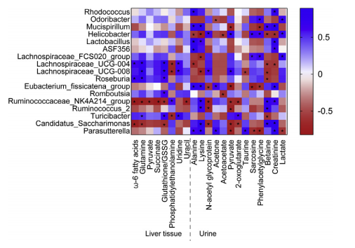 圖9. 小鼠腸道菌群在屬水平上的紊亂以及肝臟和尿液代謝產(chǎn)物的改變之間的相關性