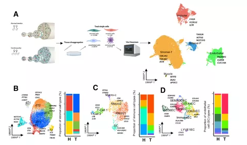 (A) 使用正常(n=4,人腘繩肌腱)和患?。‰觳?,n=5,人岡上肌腱)人肌腱用于單細(xì)胞分析。UMAP展示了具有標(biāo)記基因的內(nèi)皮細(xì)胞、免疫細(xì)胞、基質(zhì)肌腱細(xì)胞和基質(zhì)壁細(xì)胞。(B) 肌腱的基質(zhì)細(xì)胞:壁肌腱細(xì)胞 (mT)、正常肌腱細(xì)胞 1 (nT1)、正常肌腱細(xì)胞 2 (nT2)、患病肌腱細(xì)胞 1 (dT1)、患病肌腱細(xì)胞 2 (dT2)、患病肌腱細(xì)胞 3 (dT3) 和患病循環(huán)肌腱細(xì)胞 (dTc)。(C) 肌腱的免疫細(xì)胞:樹(shù)突狀細(xì)胞 (DC)、巨噬細(xì)胞 1 (Macro1)、巨噬細(xì)胞 2 (Macro2)、循環(huán)巨噬細(xì)胞 (Macro-C)、T-Cells1 (T-Cell1) 和 T-Cells2 (T-Cell2)。(D) 肌腱的內(nèi)皮細(xì)胞 (EC):CD36 high EC (CD36EC)、E-Selectin EC (CD62eEC)、膠原 4 血管 EC (COL4aEC)、免疫樣 EC (ImmuneEC)、LYVE1 陽(yáng)性 EC (LYVE1EC) 和 SEMA3G 陽(yáng)性 EC (SEMA3GEC)。